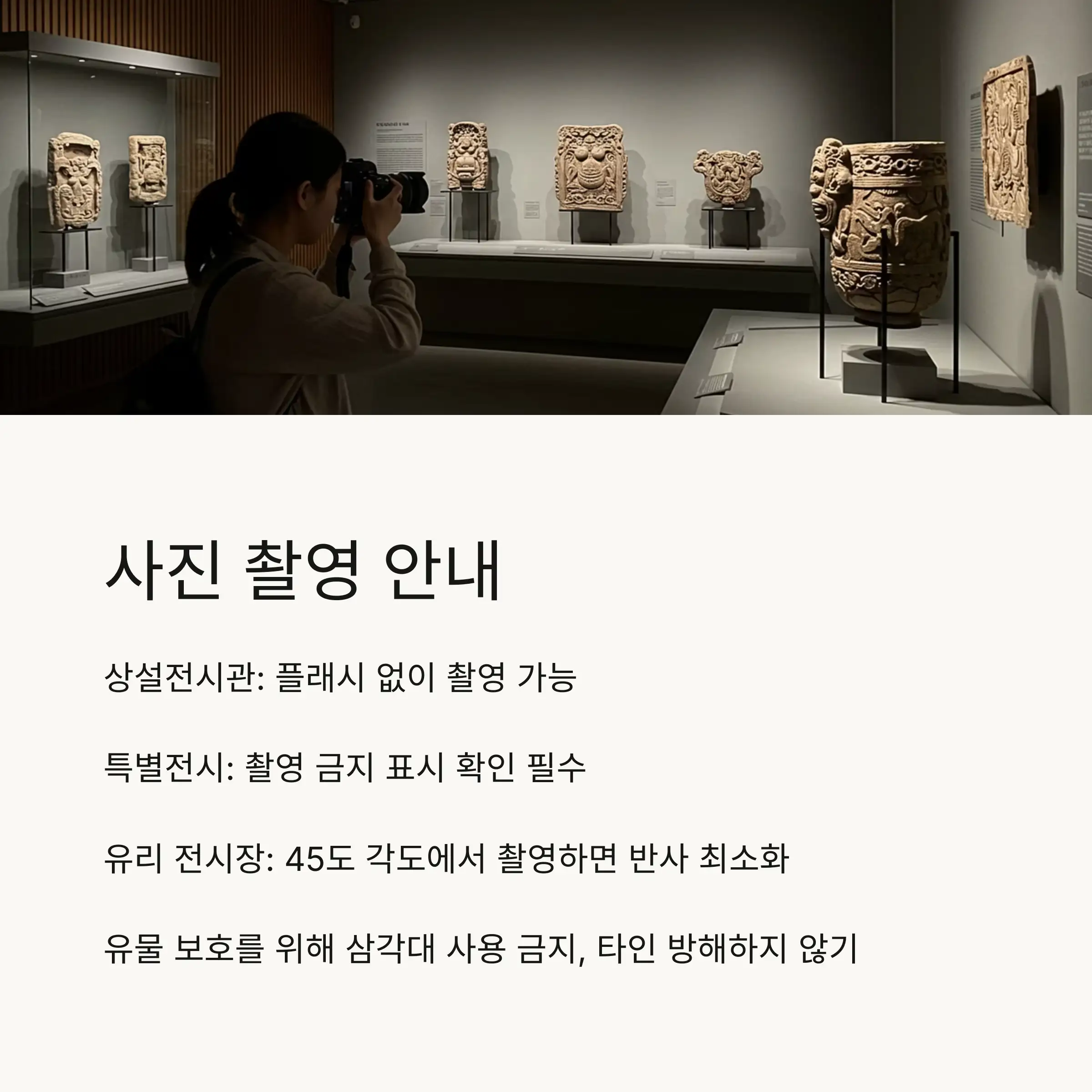 A5. 대부분의 상설전시관에서는 플래시를 사용하지 않는 개인 촬영이 가능해요. 다만 특별전시나 일부 민감한 유물은 촬영이 금지될 수 있으니 촬영 금지 표시를 확인하세요. 상업적 목적의 촬영이나 삼각대 사용은 사전 허가가 필요해요. 유리 전시장 촬영 시에는 반사를 피하기 위해 각도를 조절하면 더 좋은 사진을 찍을 수 있어요!