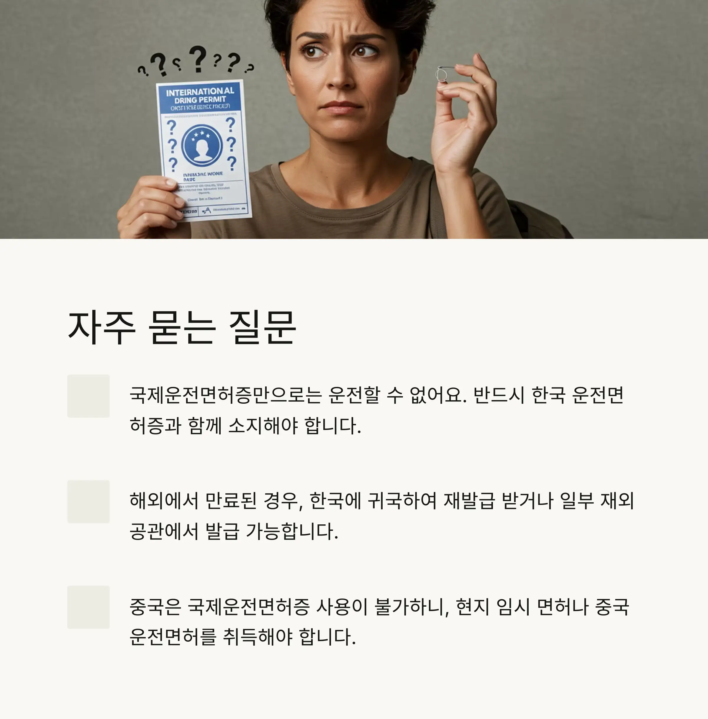 Q1. 국제운전면허증만 있으면 해외에서 운전할 수 있나요?