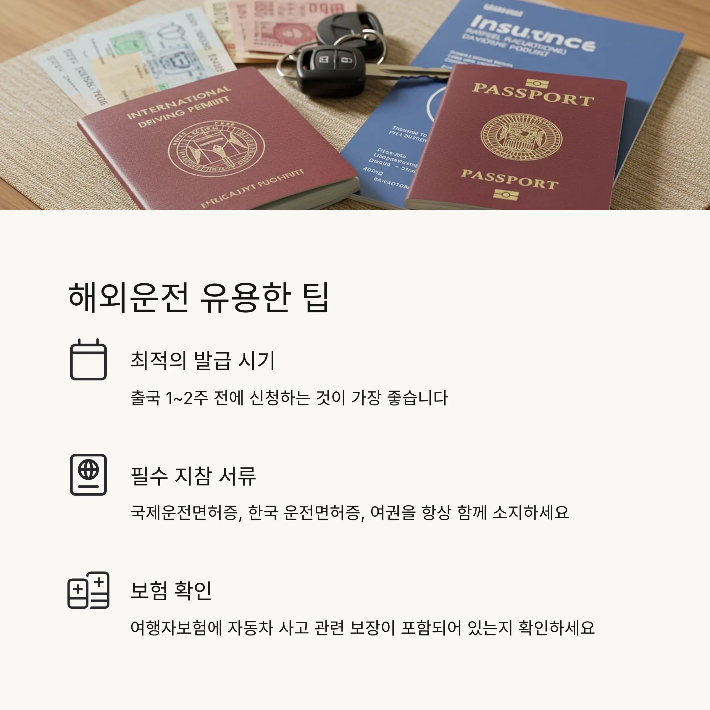 | 여행자보험 증서 | 권장 | 운전 사고 보장 포함 확인 |