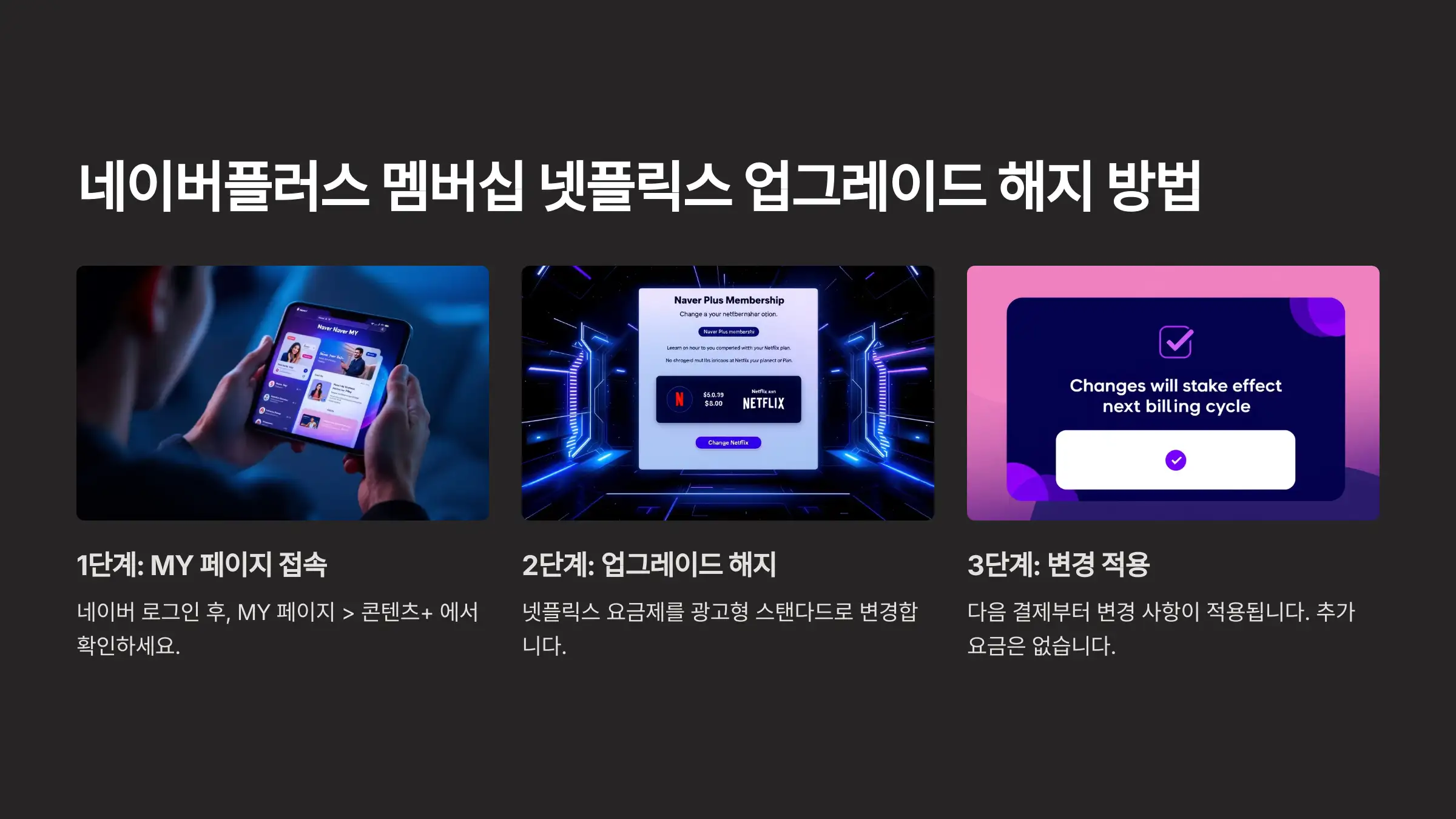 A1. 네이버 MY 페이지에서 콘텐츠+ 탭에 접속 후 현재 사용 중인 넷플릭스 업그레이드 요금제를 선택하여 광고형 스탠다드로 변경하면 됩니다.