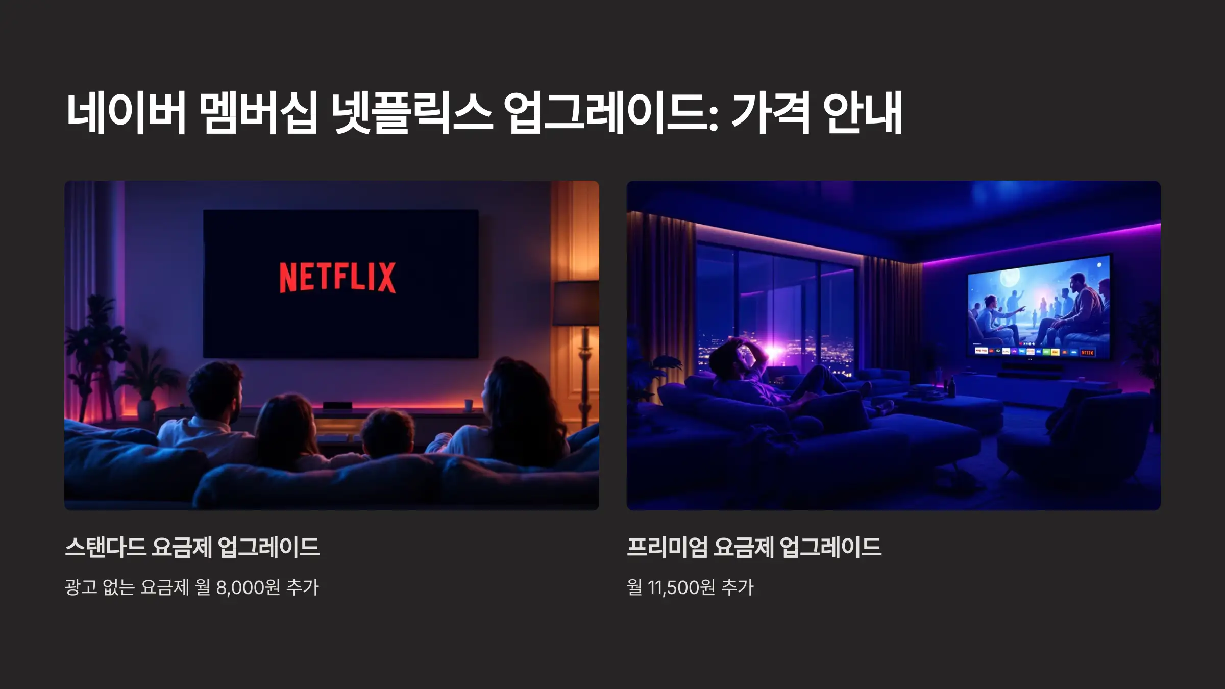 A1. 네이버플러스 멤버십은 넷플릭스 광고형 스탠다드 요금제를 기본 제공하며, 연간 구독 시 네이버플러스 멤버십 요금이 할인되어 월 최저 3,900원으로 이용할 수 있습니다. 업그레이드 시 스탠다드 요금제는 월 8,000원, 프리미엄 요금제는 월 11,500원의 추가 요금이 발생하며, 이는 기존 넷플릭스 요금제 대비 할인된 금액으로 이용 가능합니다.