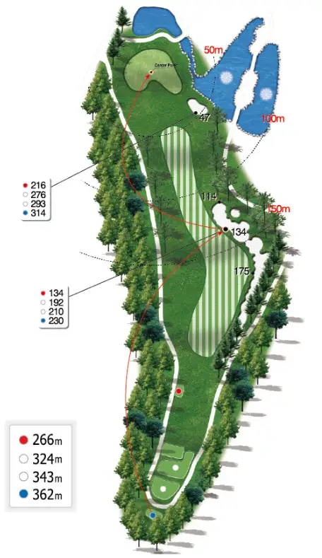 우도그렉 구조로, 해저드는 페어웨이 중앙보다 좌측에 있어요. 우측 소나무 숲은 위험 지역이니, 페어웨이 좌측 공략이 안정적이에요. 단, 러프와 경사면도 조심! 그린은 평이하지만, 넘기면 어프로치가 어렵기 때문에 핀보다 짧게가 안전해요.