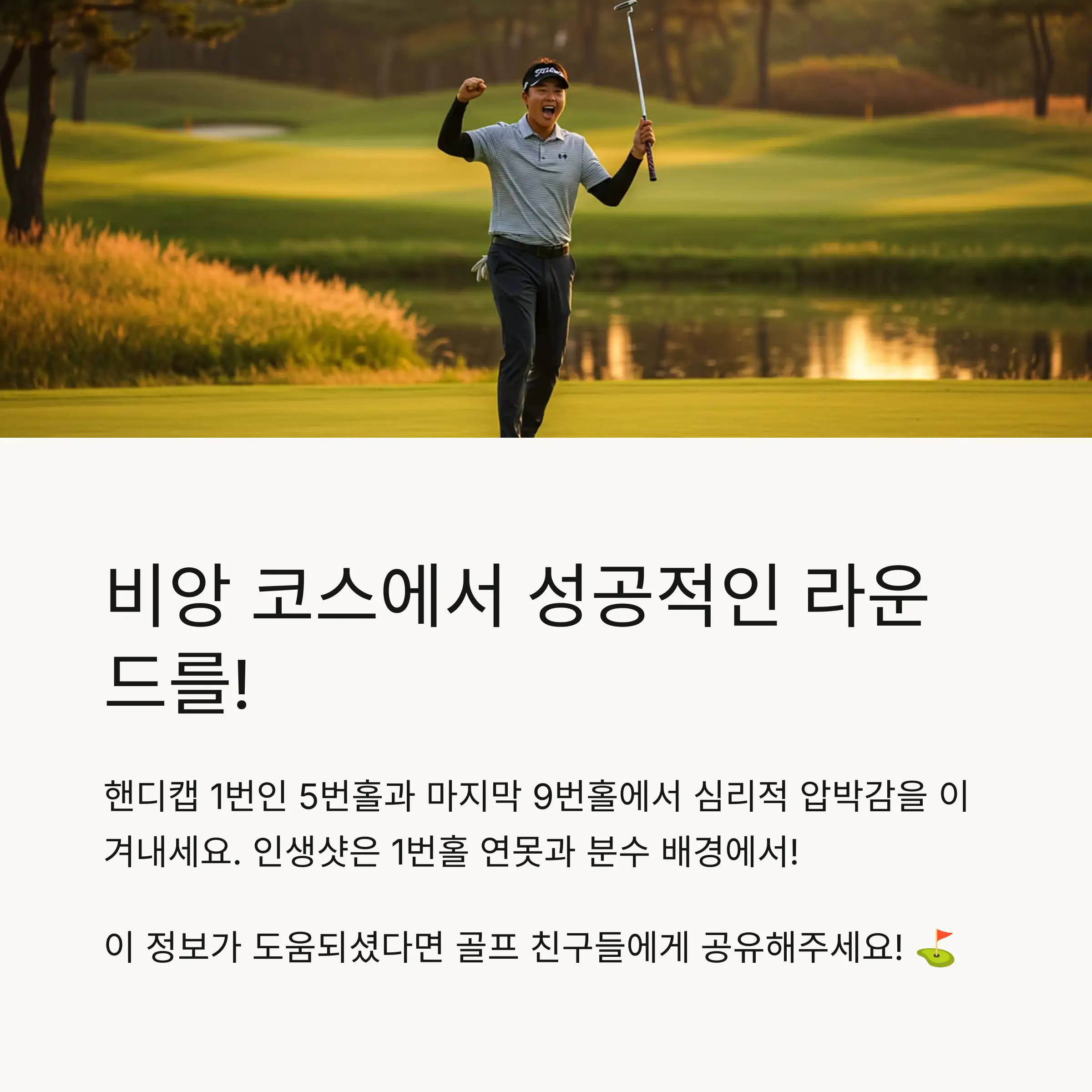 비앙 코스는 전체적으로 부담 없는 거리와 편안한 페어웨이가 장점이지만, 방심하면 의외의 함정에 빠지기 쉬운 코스예요. 아래 팁을 기억하면 실수 없이 즐거운 라운드를 할 수 있어요! 🎯