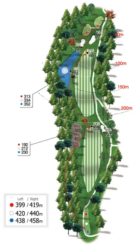 거리: Blue 438~458m / White 420~440m / Red 399~419m