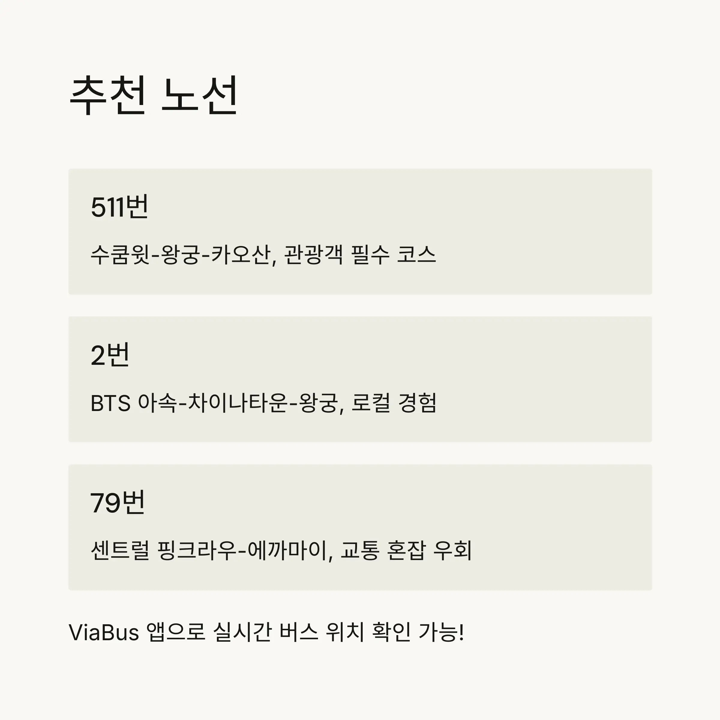 비에어컨 버스는 노선도 복잡하고, 정류장 안내도 거의 없어요. 그래서 ‘ViaBus’ 앱이나 구글 지도를 꼭 활용해 실시간 버스 위치와 목적지를 확인하는 게 중요해요. 간혹 외국인에게 낯설게 느껴질 수 있지만, 현지인과 부대끼며 여행을 즐길 수 있는 좋은 경험이 될 거예요.