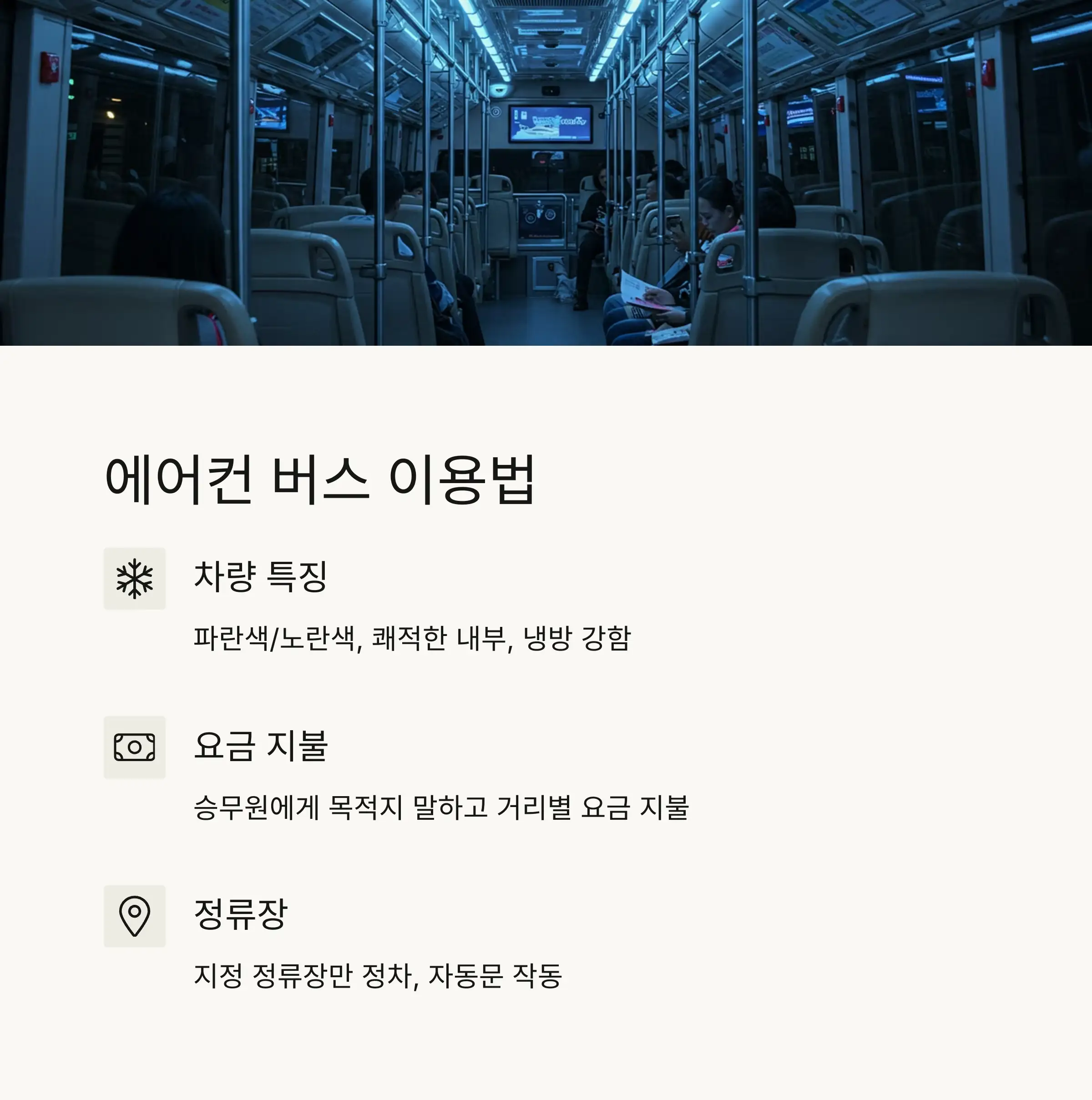 이제 요금 체계와 지불 방식까지 알았으니, 다음은 ‘에어컨 버스’에 대해 좀 더 깊이 알아볼게요. 어떤 점이 좋은지, 불편한 건 없는지 알려드릴게요 ❄️