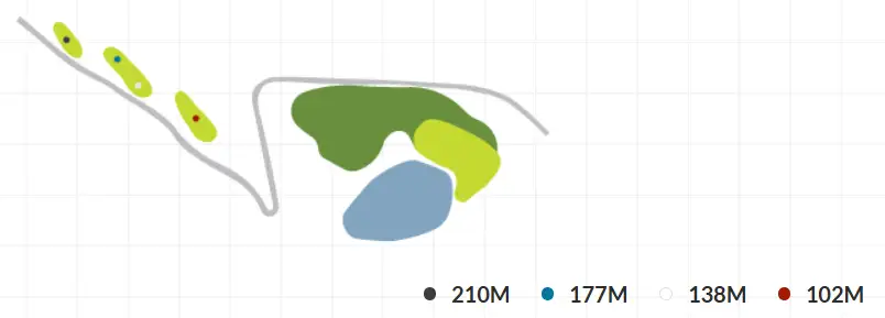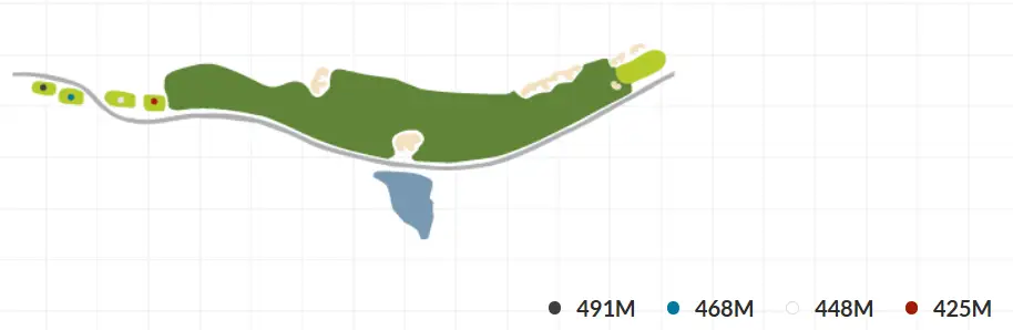 미쁨코스의 대미를 장식하는 파5 홀로, 그린 뒤편의 환상적인 폭포와 클럽하우스가 보이는 아름다운 마무리 홀이에요. 오른쪽 전체가 물로 이어져 있어 조심해야 하지만, 티샷의 랜딩 지점에 있는 벙커들은 장타자에게만 영향을 줍니다. 페어웨이 중앙의 벙커는 세컨샷에서 충분히 넘길 수 있어요. 그린은 비교적 평평해서 그린에 올리기만 하면 버디나 파를 기대할 수 있습니다. 코스의 마지막을 화려하게 장식해보세요! 🏞️