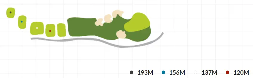 급경사 내리막에 위치한 파3 홀로, 그린 주위에는 벙커와 연못이 있어 정확한 티샷이 중요해요. 그린 뒤쪽으로는 급격한 내리막 경사가 있어 오버그린을 조심해야 합니다. 그린에는 두 개의 능선이 있어 퍼팅 라인 읽기가 까다로울 수 있어요. 클럽 선택이 스코어를 좌우하는 홀이니 풍향과 고도 차이를 잘 고려하세요. 💧