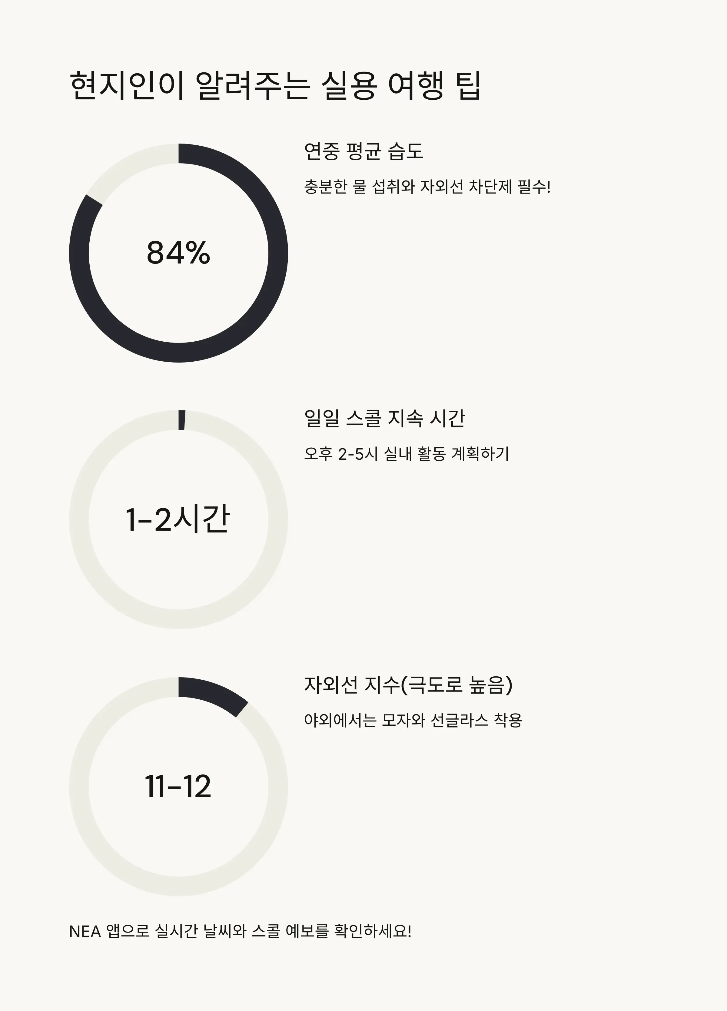 싱가포르는 북위 1도에 위치한 열대 우림 기후 지역으로, 일년 내내 고온다습한 날씨가 특징이에요. 평균 기온은 낮 31도, 밤 24도 정도로 연중 큰 변화가 없지만, 습도가 평균 84%에 달해 체감온도는 훨씬 높게 느껴져요. 이런 기후 특성을 이해하는 것이 싱가포르 여행 계획의 첫걸음이에요.