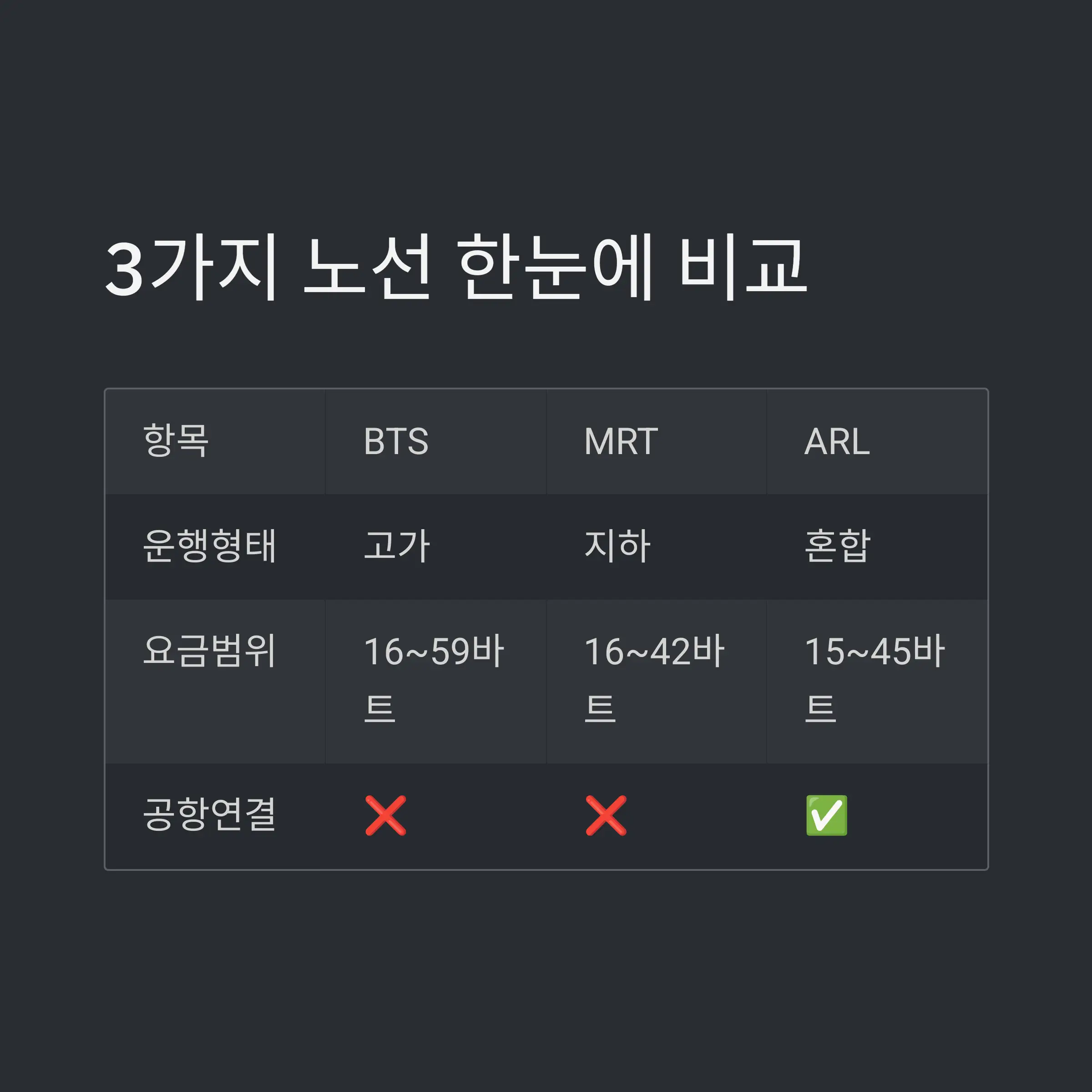 BTS, MRT, ARL 차이 한눈에 보기