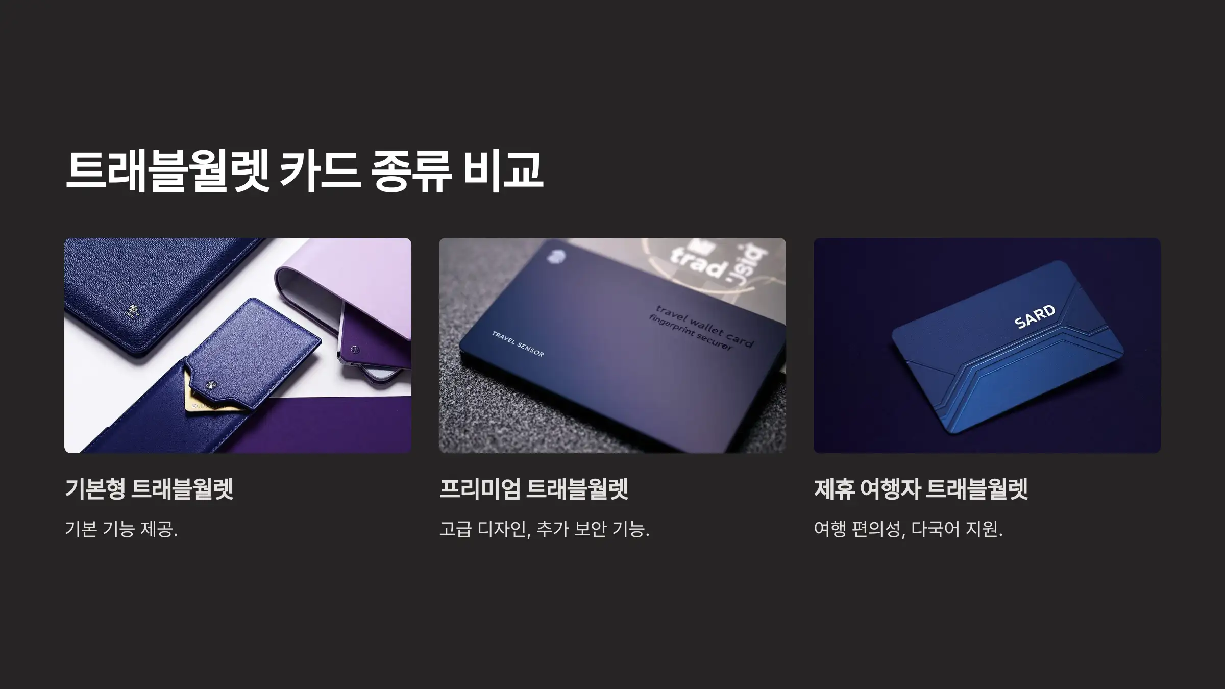 트래블월렛은 사용자의 목적과 편의성에 따라 다양한 종류의 카드를 제공합니다. 각 카드의 특징과 혜택을 비교하여 자신에게 맞는 카드를 선택하세요.