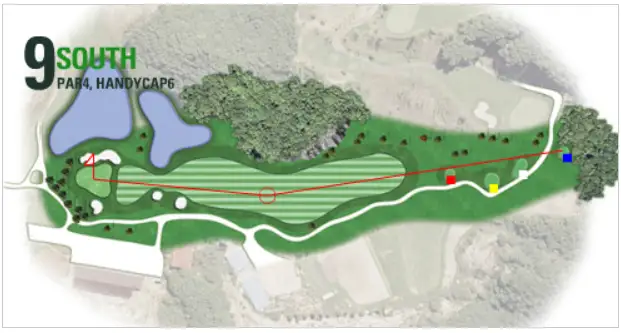 9번홀은 남코스의 마지막 파4홀이며, 백티 기준 366m예요. 좌측 OB와 정면 해저드, 그리고 좌우 벙커까지 있어 플레이가 쉽지 않아요. 티샷 방향은 벙커와 해저드 중앙을 기준으로 하고, 스트레이트 구질이 가장 유리해요.