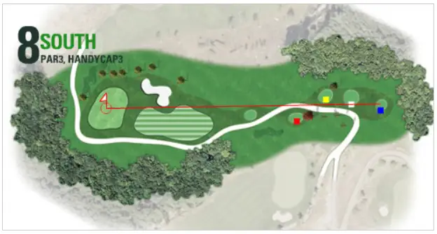 8번홀은 남코스에서 가장 까다로운 파3 중 하나예요. 백티 기준 187m로 거리가 제법 있고, 내리막이지만 우측 OB가 있어서 방향성이 생명이에요. 특히 우측 내리막 그린은 런이 많이 발생해, 짧게 치지 않으면 공이 흘러내릴 위험이 있어요.