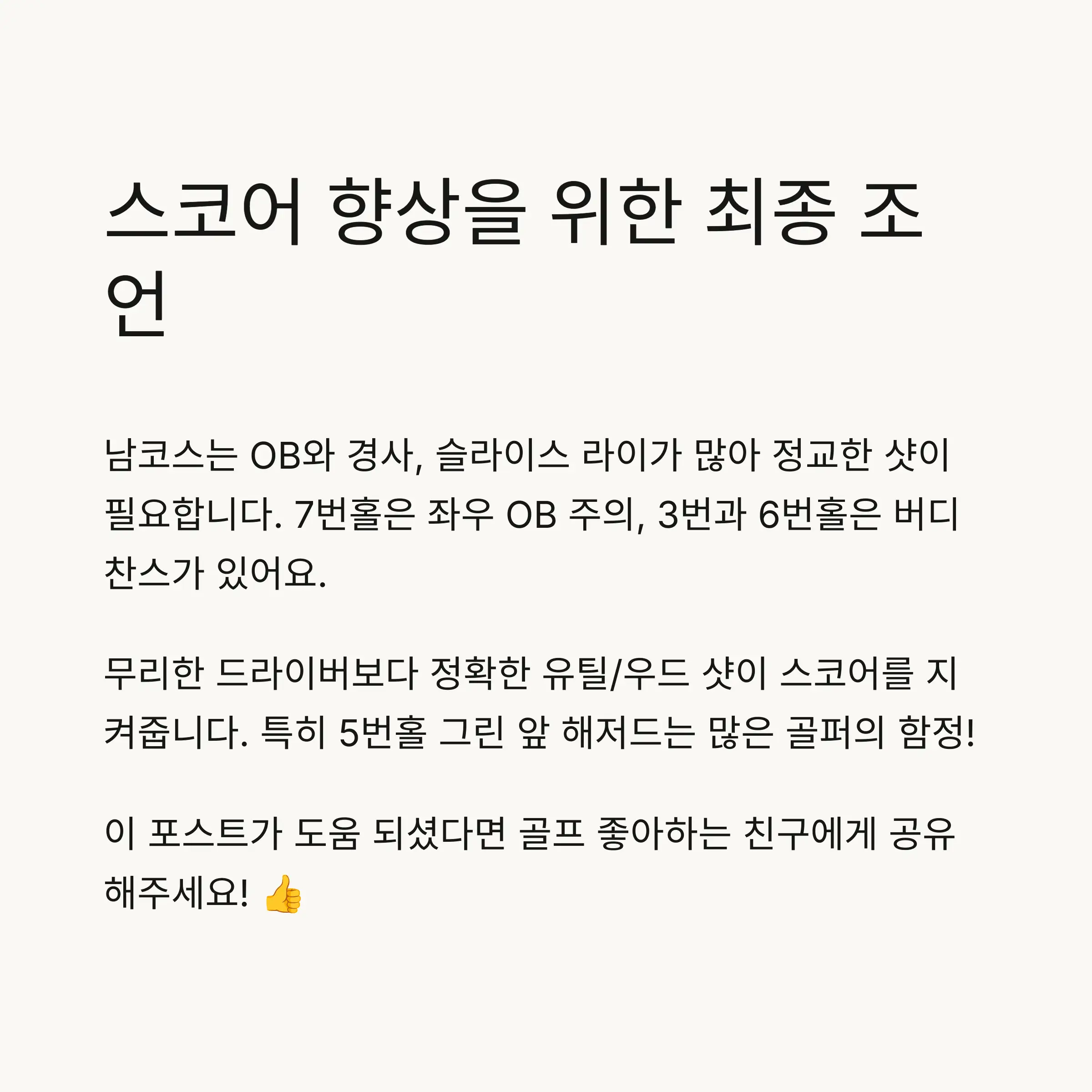| 7번홀 | 짧은 파4, 좌우 OB | 유틸 티샷, 파 세이브 집중 |