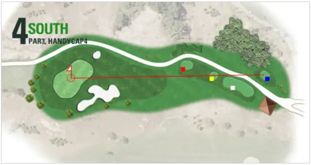 4번홀은 남코스의 첫 파3홀이며, 백티 기준 141m로 짧은 편이에요. 하지만 좌측 OB가 가까워서 티샷에서 방심하면 바로 손해를 봐요. 그린은 우측으로 살짝 내리막 경사를 가지고 있어서 너무 우측으로 가면 런이 발생하며 그린 밖으로 흘러나갈 수 있어요.