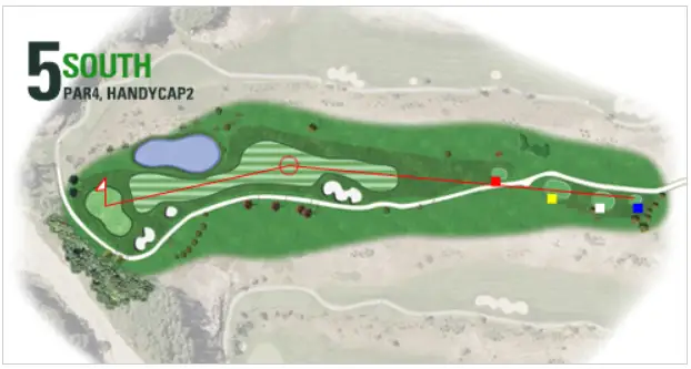 5번홀은 핸디캡 2번의 파4홀로, 해저드가 앞에 놓여 있는 내리막 홀이에요. 맞바람과 슬라이스성 바람이 동시에 불기 때문에 방향성은 물론 탄도 조절이 중요해요. 티샷은 페어웨이 중간을 기준으로 낮은 탄도로 보내는 게 좋아요.