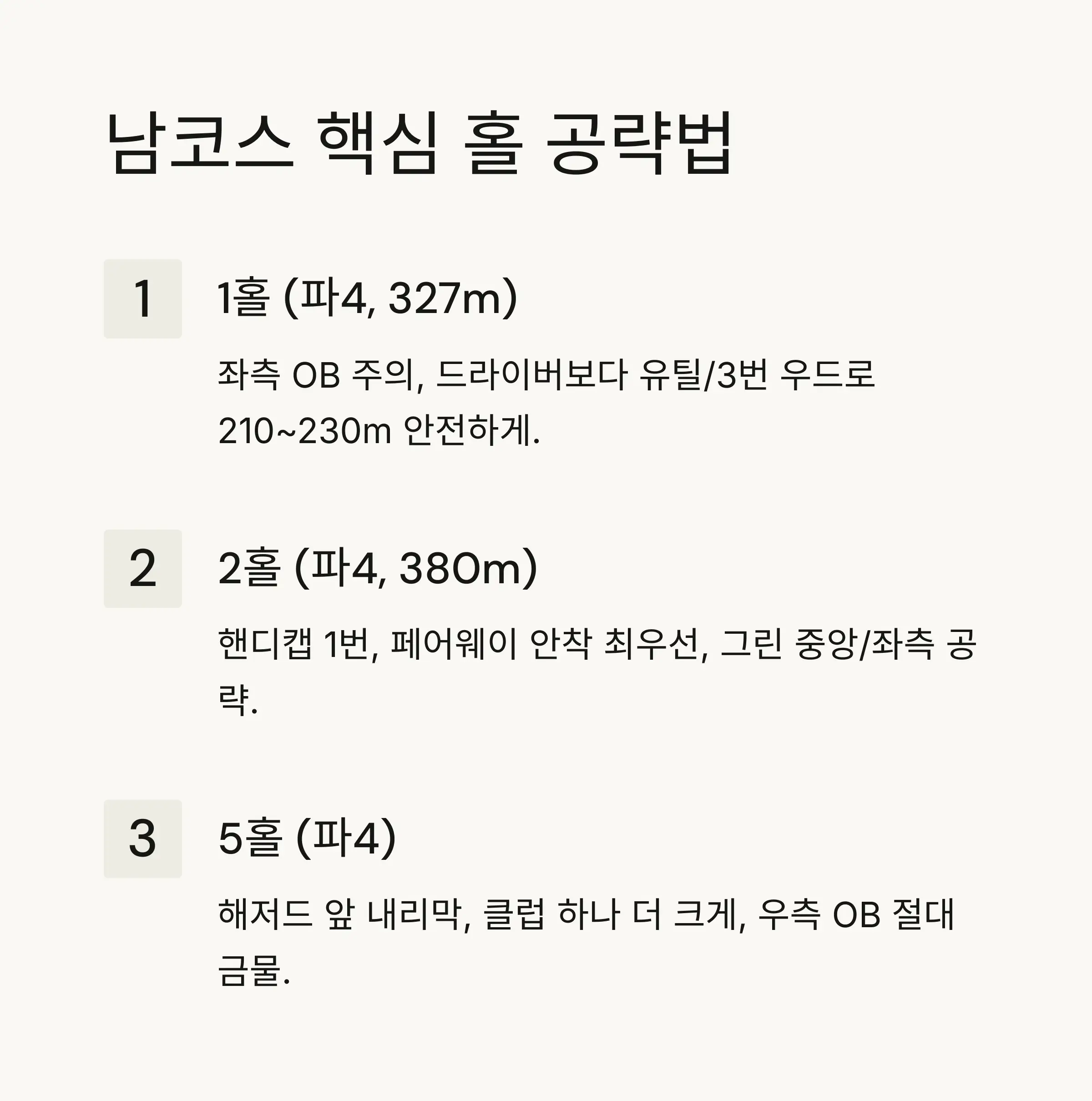 제가 실제 라운딩을 돌면서 느낀 점과 각 홀의 리스크 포인트, 공략 루트, 클럽 선택 팁까지 실속 있게 정리했어요. 남코스만의 특징을 파악하고 나면, 스코어가 훨씬 안정적으로 나오는 걸 바로 체감할 수 있어요. 이제 1번홀부터 하나씩 공략해볼까요? 😄