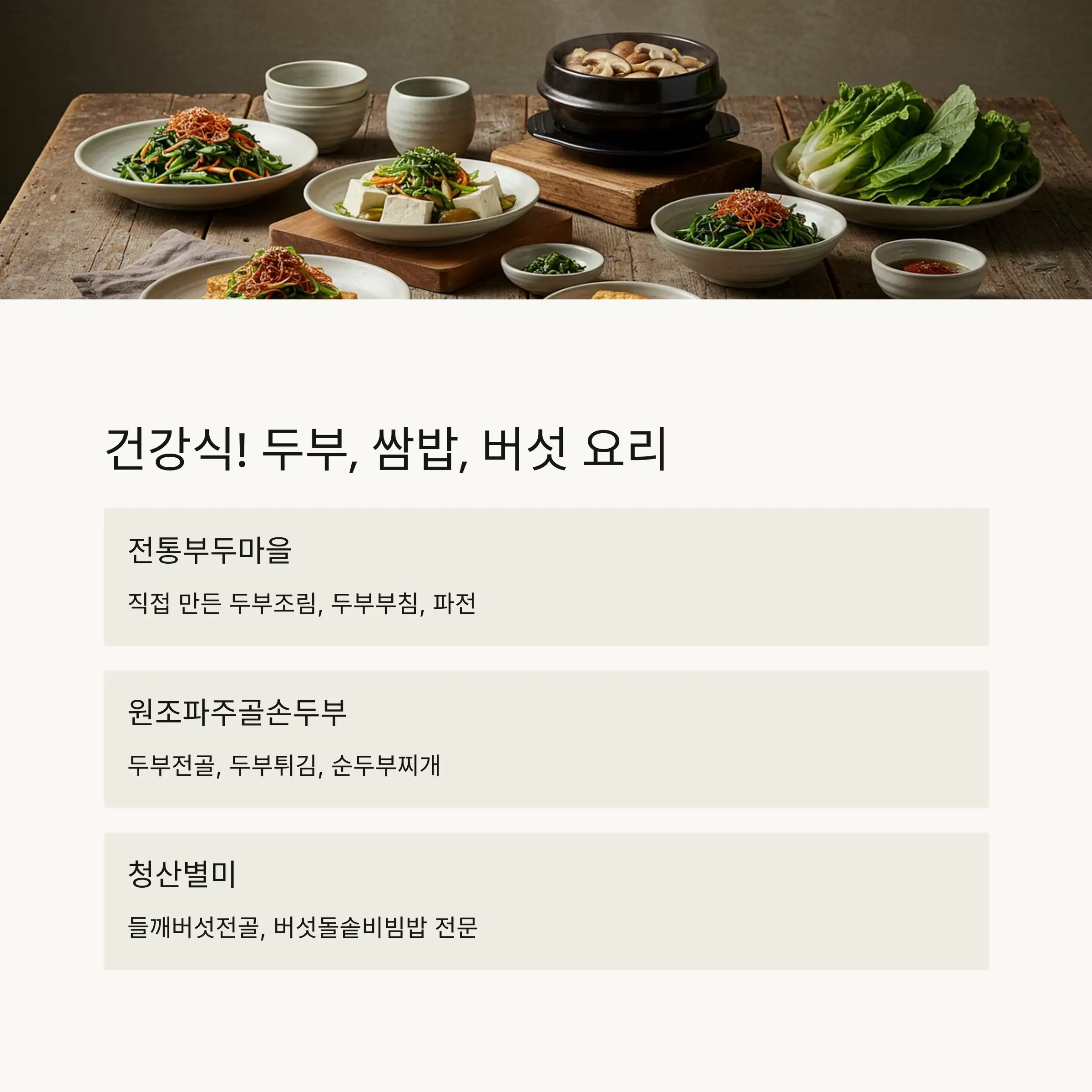 자극적이지 않은 음식을 찾는다면 두부요리나 버섯요리를 추천해요. 부담 없는 한 끼로 속까지 편안하게 만들어줄 식당들이에요.