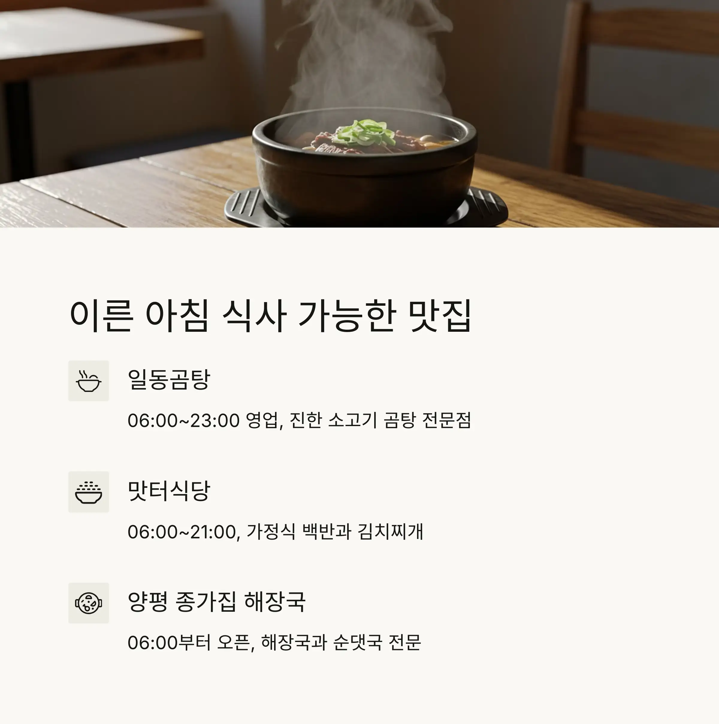 A1. 대부분의 맛집은 오전 6시부터 시작되며, 일동곰탕과 맛터식당이 가장 이른 시간부터 열어요.