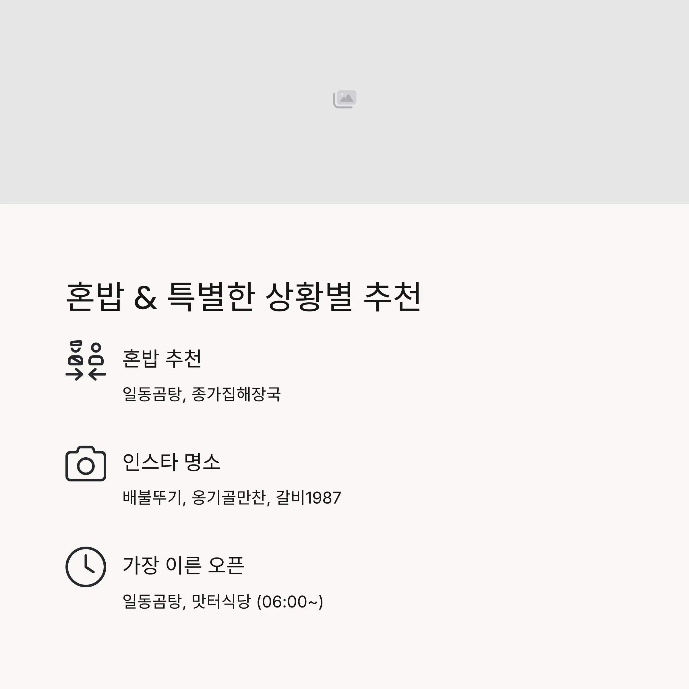 A4. 곰탕, 해장국, 백반 메뉴가 있는 일동곰탕과 종가집해장국이 혼밥하기 딱이에요.