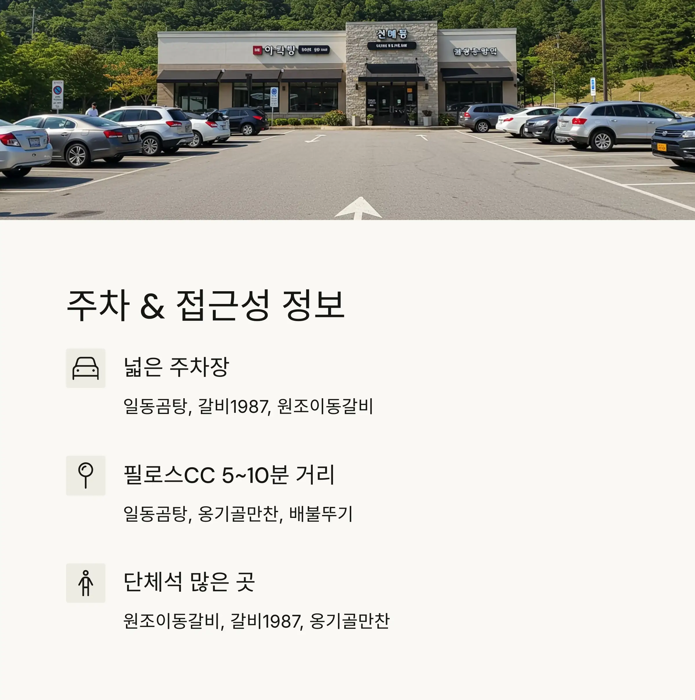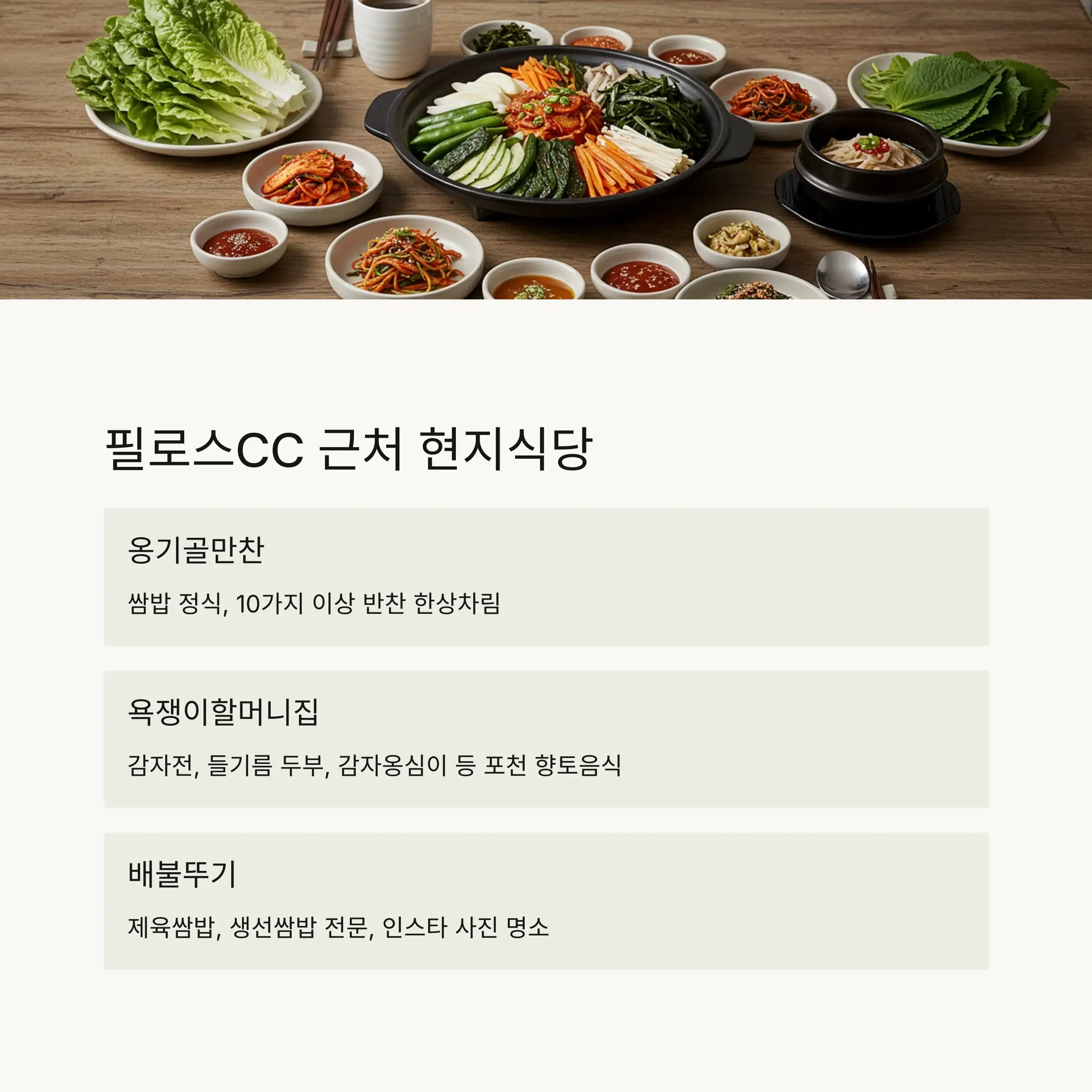 A2. 일동곰탕, 옹기골만찬, 배불뚜기 등이 필로스CC에서 차로 5~10분 거리예요.