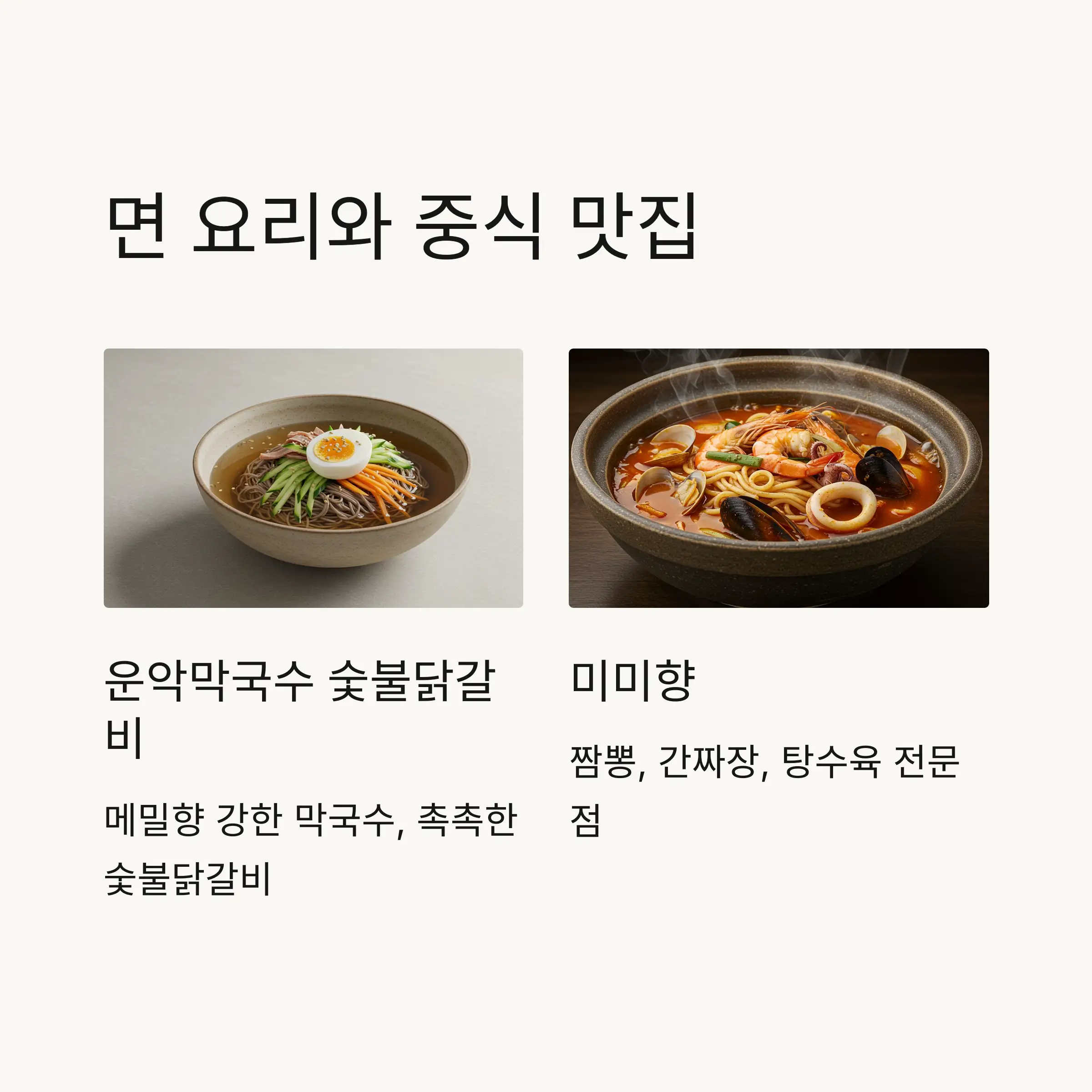 가볍게 한 끼, 또는 시원하게 땀 식히고 싶을 땐 면 요리가 딱이에요. 막국수, 짬뽕, 간짜장까지 입맛 따라 골라보세요.