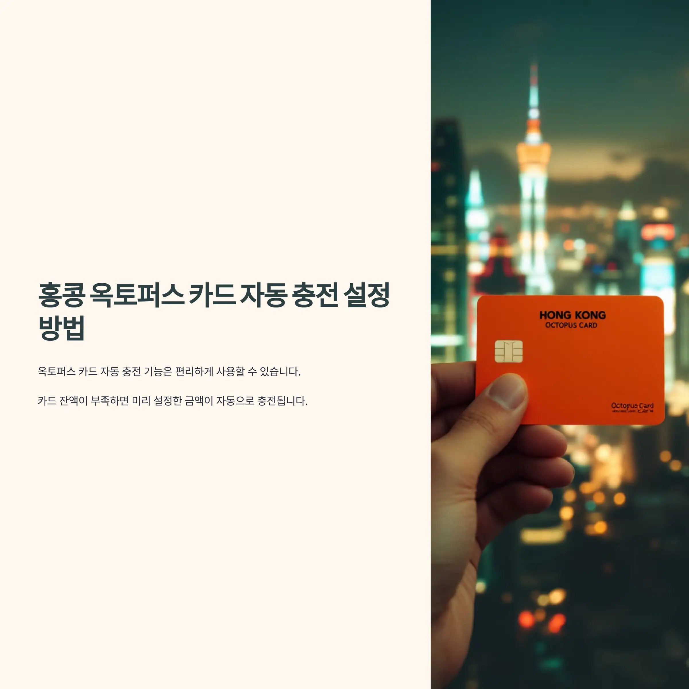 홍콩 옥토퍼스 카드의 자동 충전 설정은 편리하고 효율적인 결제 환경을 제공합니다. 위 가이드를 참고하여 설정을 완료하고, 더 편리하게 카드를 사용하세요.