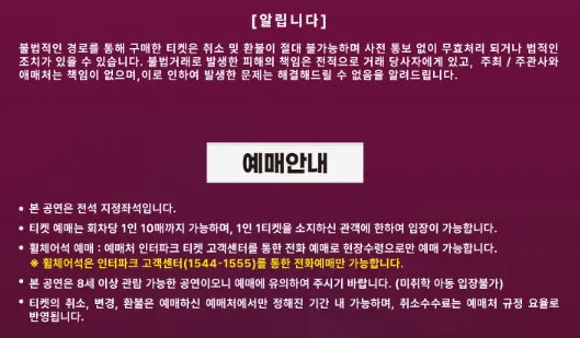 (동일 브라우저로 여러 개 창을 띄울 경우, 불법적인 메크로 예매로 인식하여 튕기는 경우가 가끔 발생됩니다.)