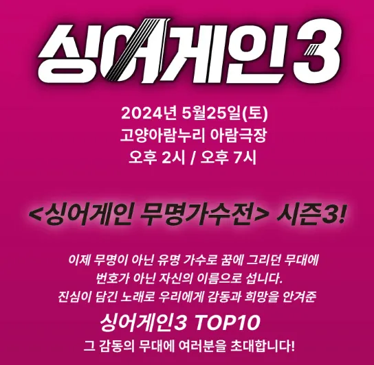 싱어게인3 TOP10 전국 투어가 5월 25일 고양아람누리 아람극장을 시작으로 고양, 성남, 울산, 전주, 청주, 제주에서 진행됩니다.