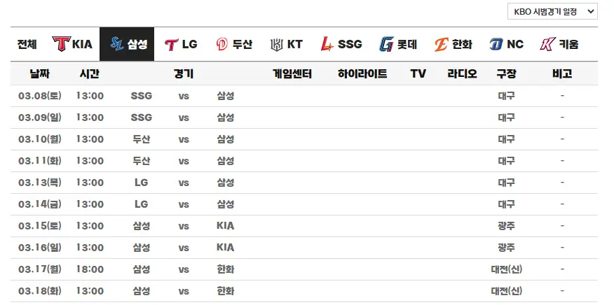 | 3월 8일(토) | 13:00 | SSG vs 삼성 | 대구 (홈) |