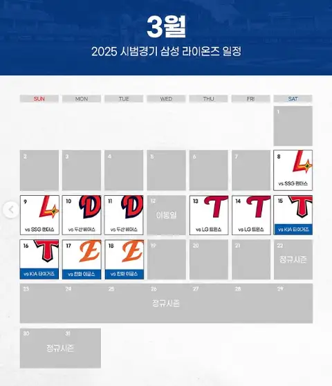 - 홈경기(대구 삼성라이온즈파크): 3월 8일~14일 (6경기)