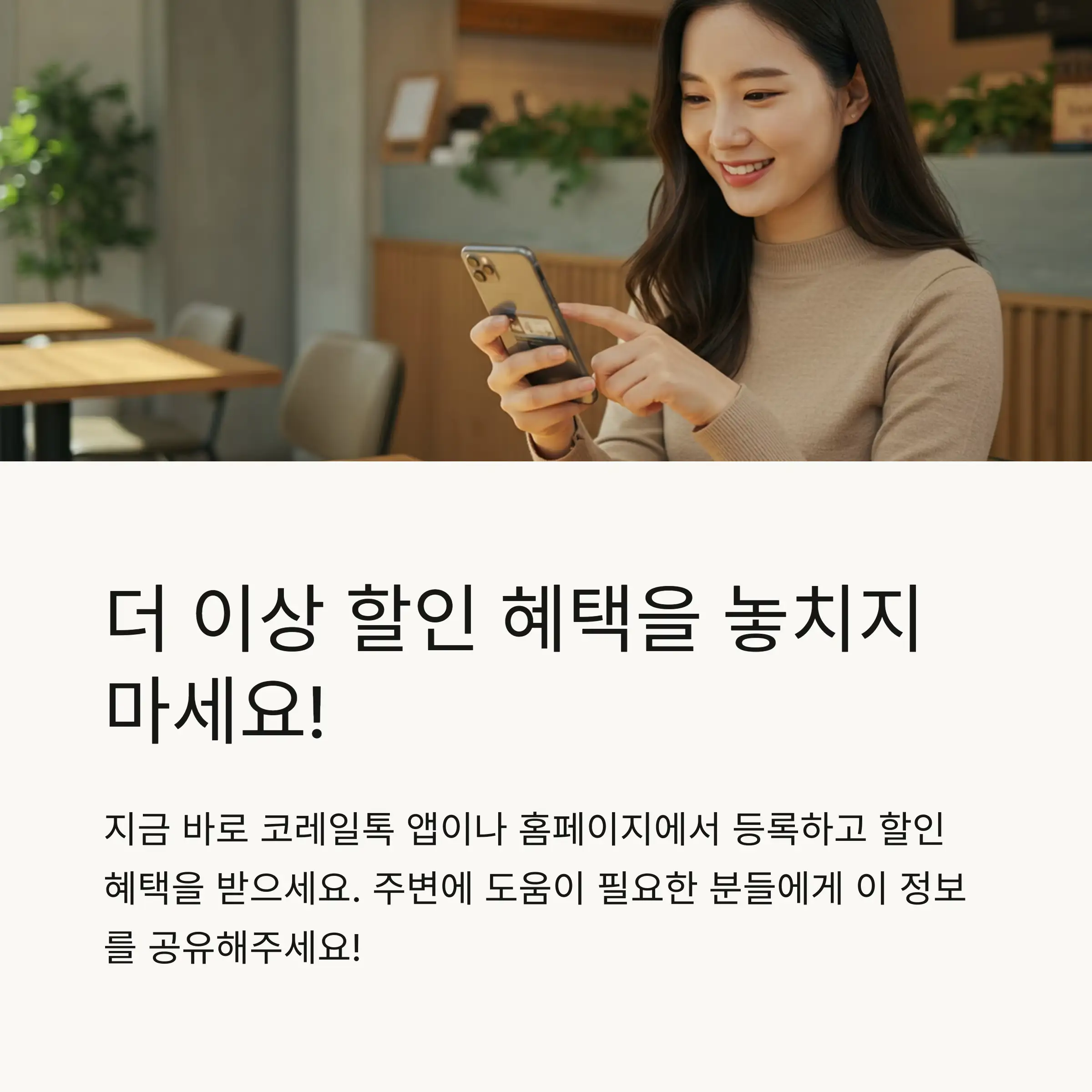 지금 바로 코레일톡 앱 또는 홈페이지에 접속해 등록부터 시작해보세요. 가족, 지인 중 혜택 대상자가 있다면 꼭 이 정보를 공유해주시고, 모두가 동등하게 이동의 자유를 누릴 수 있도록 함께 해주세요.