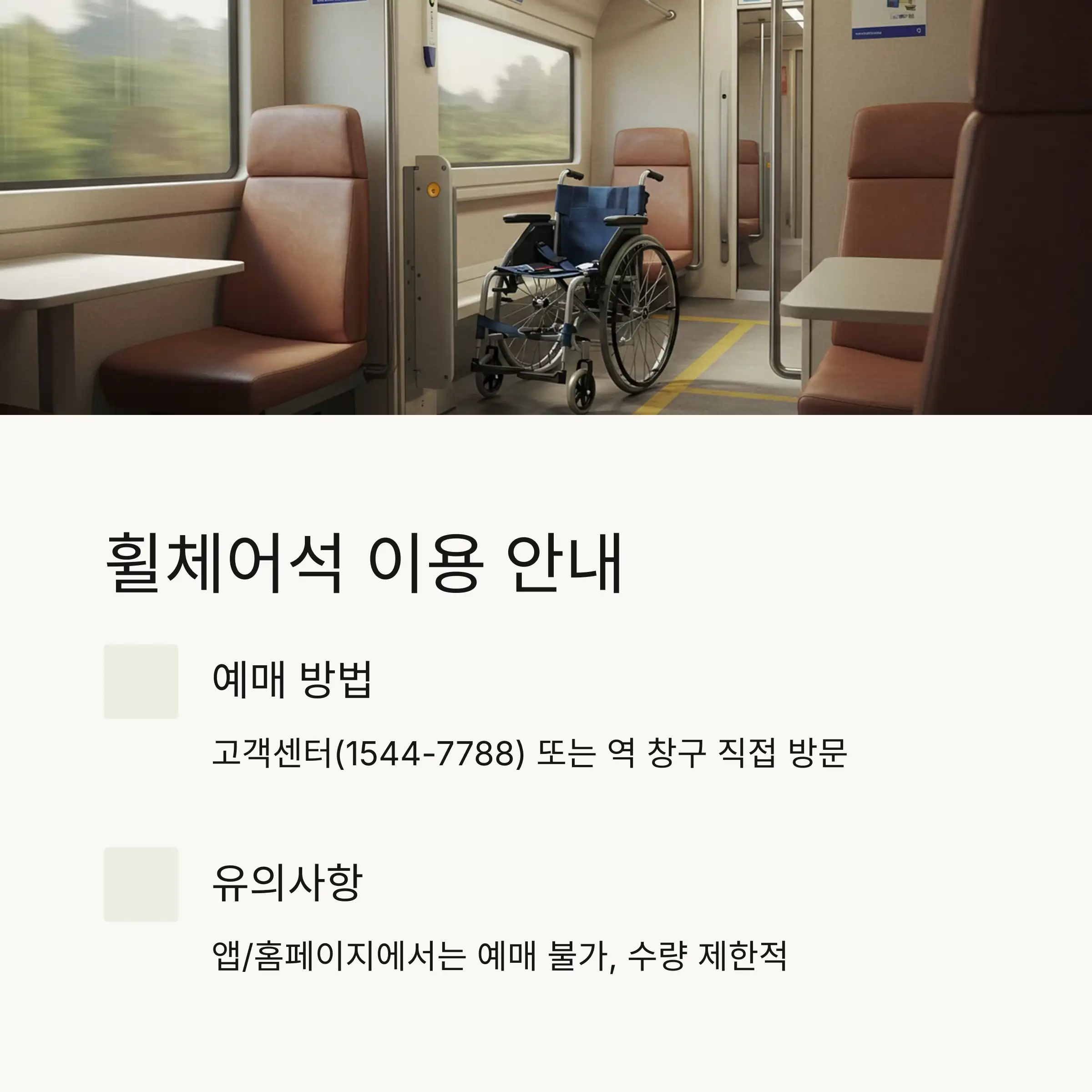 휠체어석 예매는 앱에서는 제공되지 않으므로, 필요한 경우 반드시 전화나 창구를 이용해 예약하시기 바랍니다.