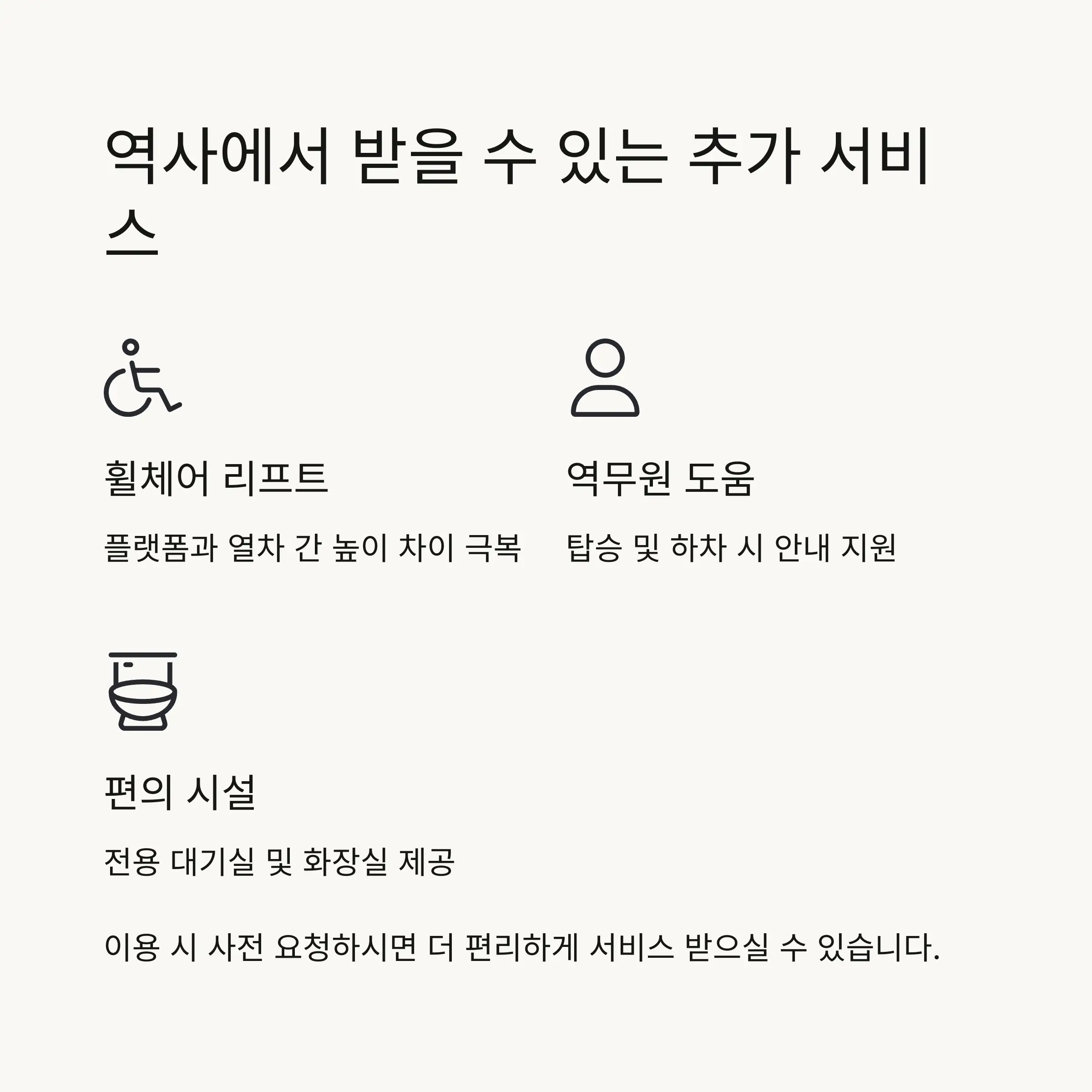 이러한 서비스는 사전 요청 또는 역 도착 후 요청을 통해 받을 수 있으며, 이용 시 편리함이 매우 크므로 적극 활용을 권장드립니다.