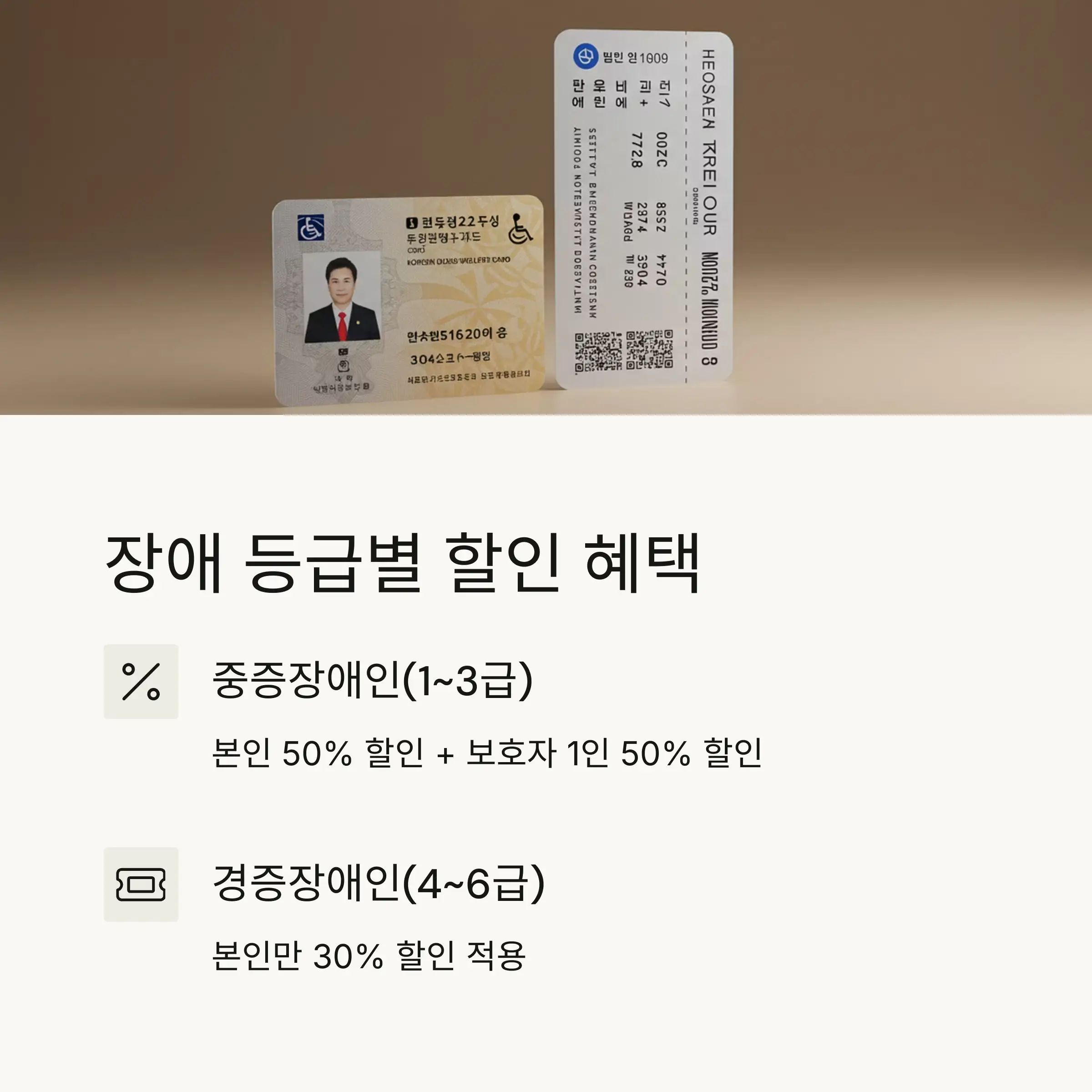 A1. 장애 등급에 따라 다르게 적용됩니다. 1~3급 중증장애인은 본인과 보호자 1인 모두 50% 할인, 4~6급 경증장애인은 본인만 30% 할인이 적용됩니다.