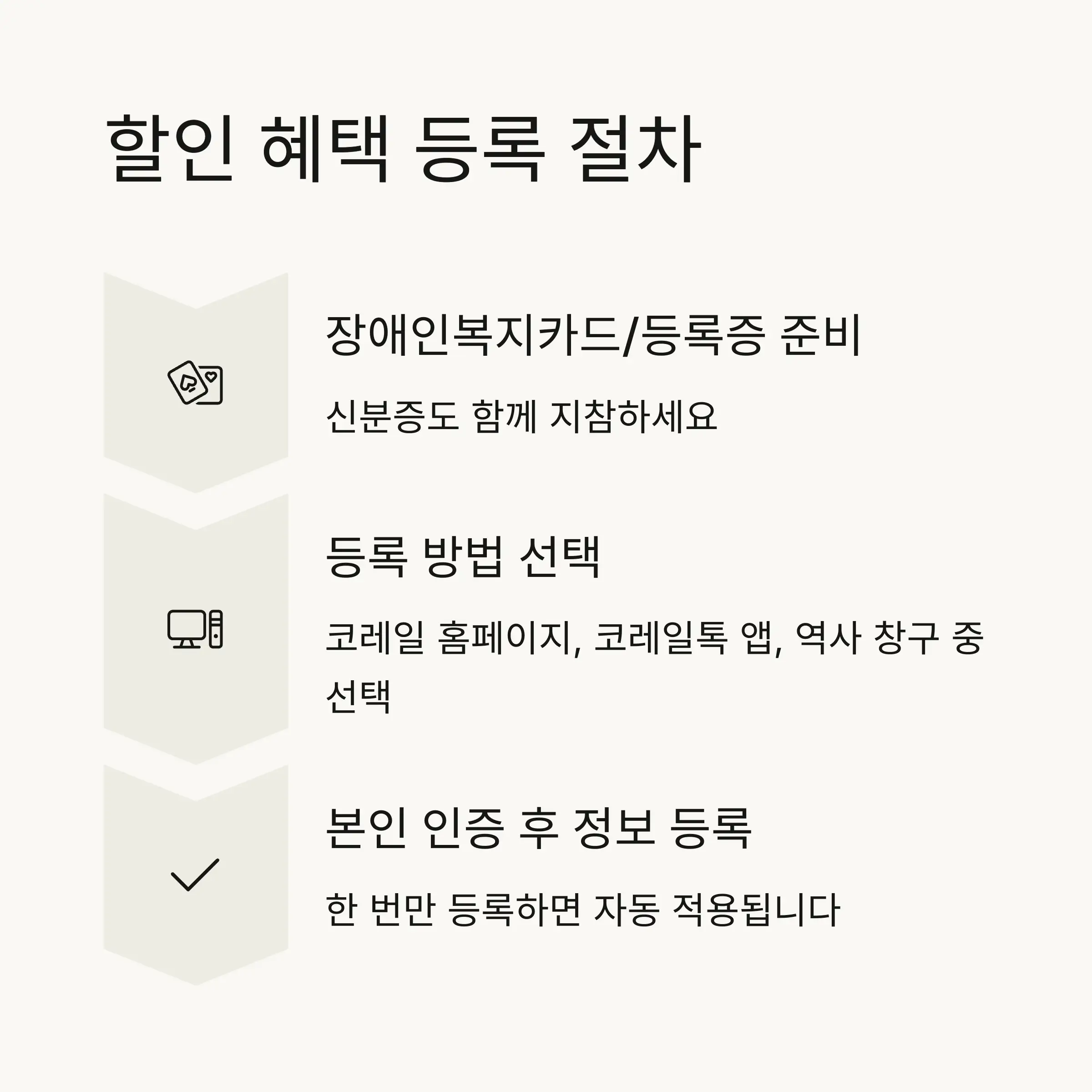 코레일에서 제공하는 장애인 할인 혜택은 장애 등급에 따라 차등 적용됩니다. 이는 국가의 장애인복지 정책과 연계된 제도로, 등록 장애인에게 정식으로 부여됩니다.