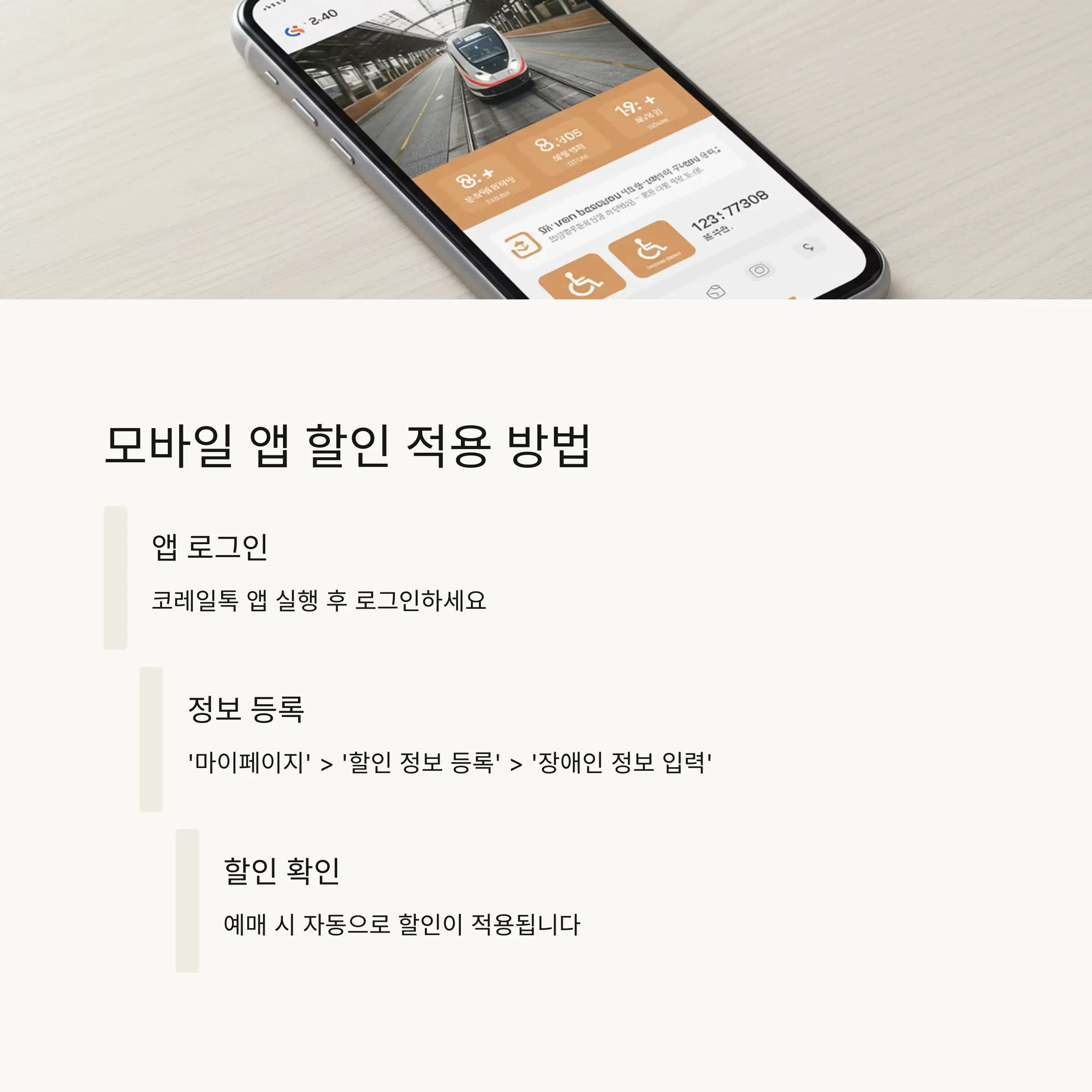 A5. 코레일톡 앱의 마이페이지에서 할인 정보 등록 메뉴로 들어가 장애인 정보를 입력하고 본인 인증을 완료하면 이후 자동으로 할인 적용됩니다.