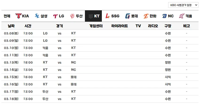 | 3월 14일(금) | 13:00 | KT vs NC | 창원 |