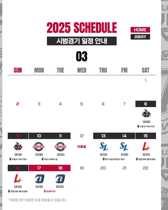 - 원정경기(수원, 사직, 대구, 문학): 3월 8일~16일 (8경기)