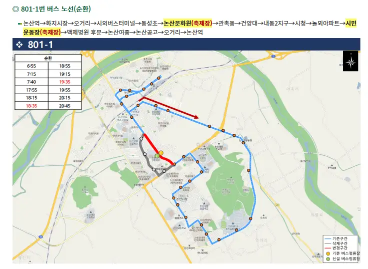 | 801-1 | 12회 | 06:55 ~ 20:45 | 논산문화원, 시민운동장 |