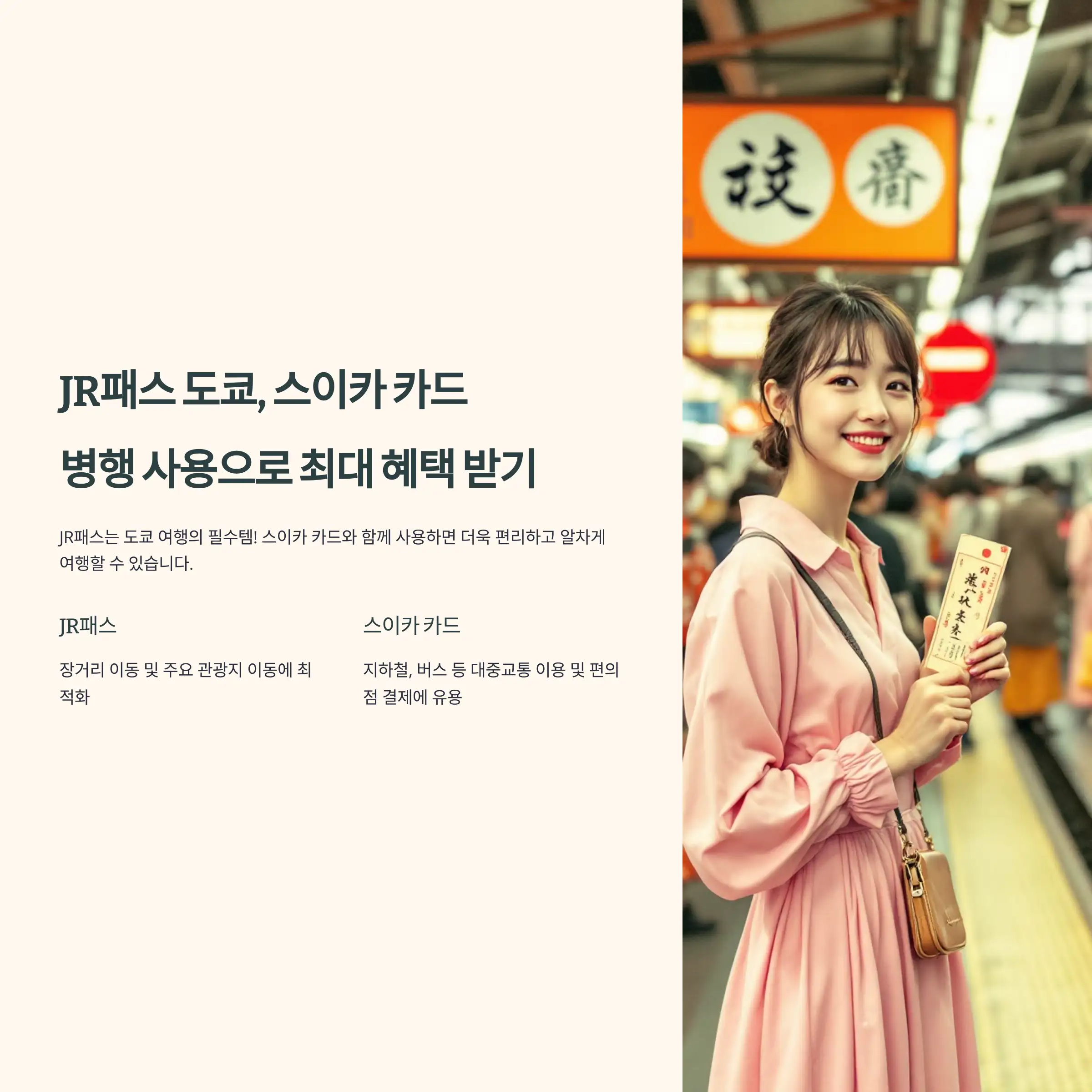 - JR패스만으로 접근이 어려운 지역(예: 롯폰기, 아사쿠사 등)에서도 스이카 카드를 사용해 추가 이동 가능.